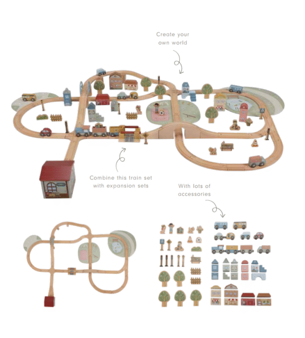 Little Dutch traukinio trasos rinkinys XL FSC – tai įspūdingas ir kūrybiškas medinis žaidimų komplektas vaikams, mėgstantiems statyti, planuoti ir kurti savo miestą. Su šiuo rinkiniu mažieji gali leistis į nuotykius, važiuodami lokomotyvu per tiltus, aplankydami pastatus, keliaudami pro medžius ir sustodami prie kelio ženklų. Didelė komplektacija ir kokybiškos detalės leidžia vaikui nuolat atrasti naujų žaidimo galimybių.